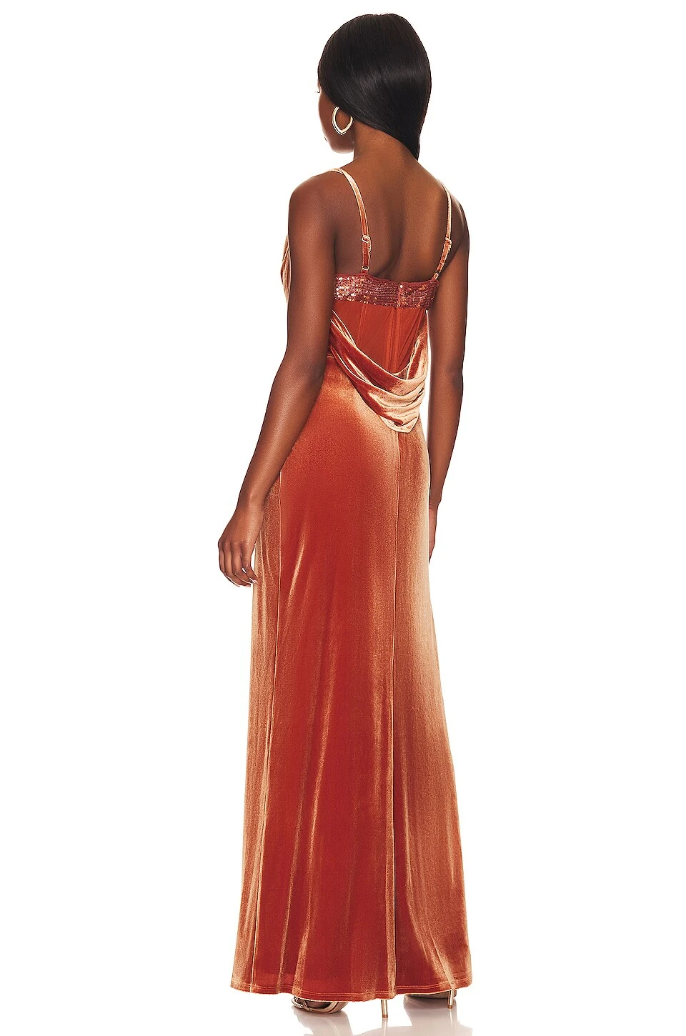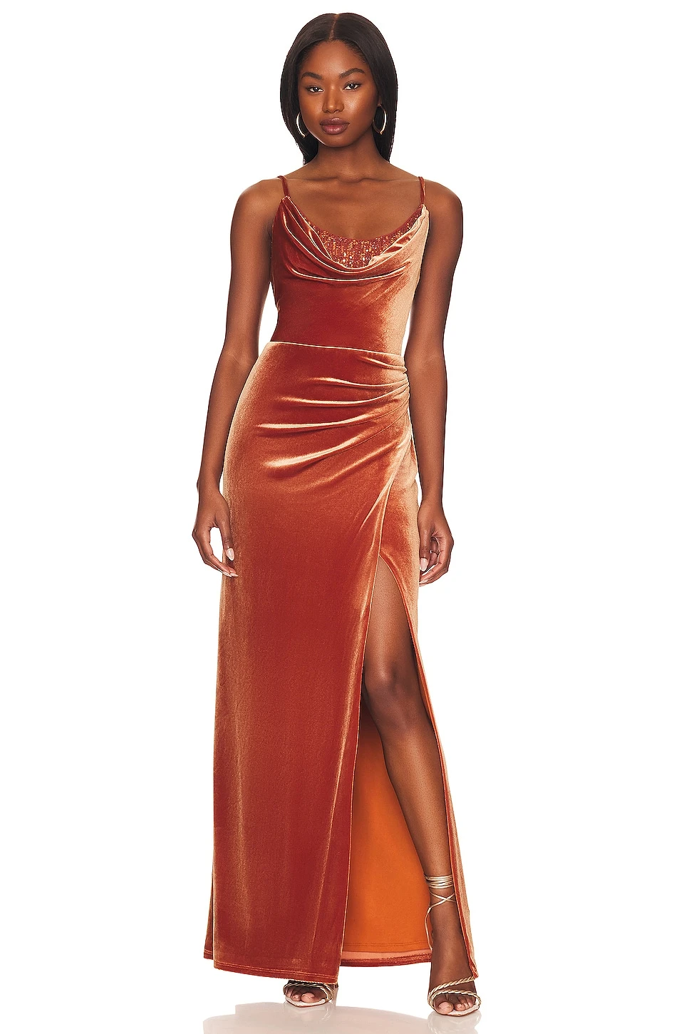 Draped cowl neckline and back with sequin embellished underlay - Ruched velvet fabric with side seam slit