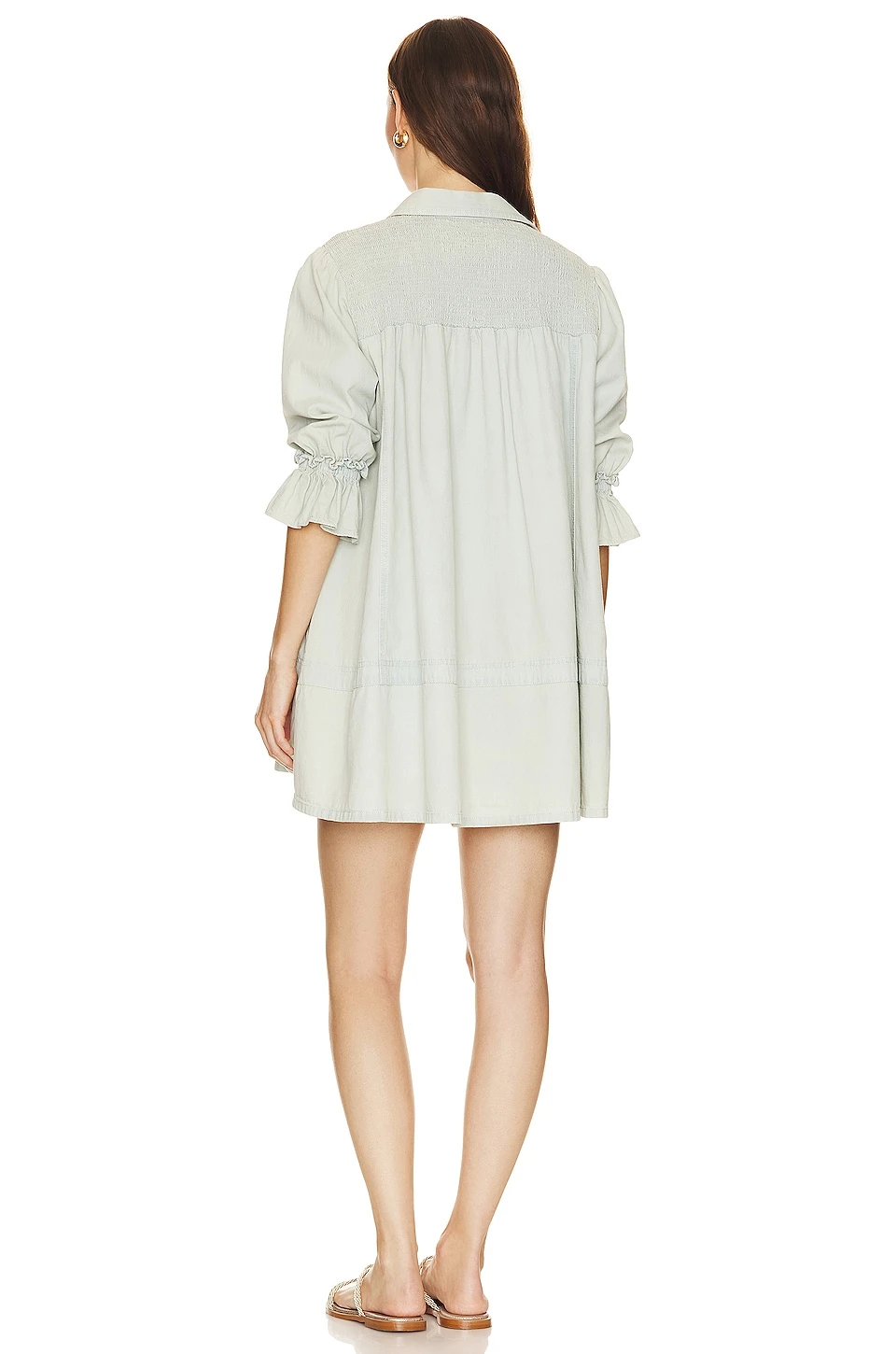 - Faded denim fabric with smocked upper panel